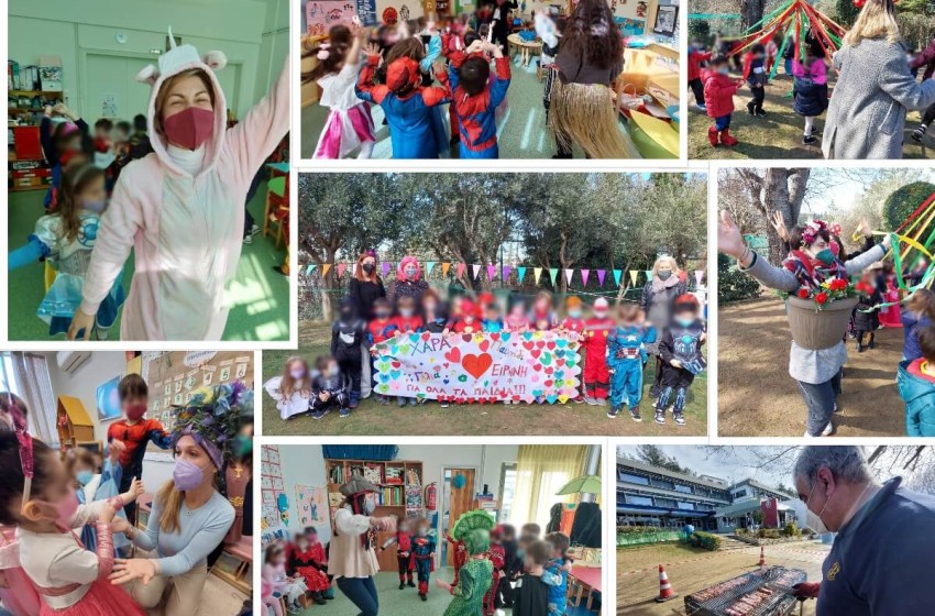 25 Φεβρουαρίου 2022Η αυλή του Σχολείου μας μύρισε τσίκνα από τα σουβλάκια που ψήσαμε, ενώ παιδικές φωνούλες και αποκριάτικα τραγούδια γέμισαν τον χώρο! Ήταν η γιορτή του Νηπιαγωγείο μας και τα μικρά μας με τις δασκάλες τους που μας έκαναν να χαμογελάσουμε και έδωσαν τον αποκριάτικο ρυθμό. Τα παιδιά μας χόρεψαν στις τάξεις τους και ύστερα, ανά τμήμα βγήκαν στην αυλή μας, όπου είχαν στηθεί ψησταριές από νωρίς το πρωί. Και επειδή η μυρωδιά πήγε και στο Δημοτικό μας, και όλοι οι μαθητές μας του Δημοτικού κεράστηκαν σε ατομική συσκευασία από ένα σουβλάκι για το καλό! Τα μικρά μας στην αυλή έπαιξαν λίμπο και φυσικά, πιστά στα έθιμά μας γύρισαν το γαϊτανάκι. Και επειδή η χαρά και η αγάπη πρέπει να μοιράζονται, έφτιαξαν με τις νηπιαγωγούς τους ένα πανό με το οποίο εύχονται χαρά και αγάπη για όλα τα παιδάκια του κόσμου!