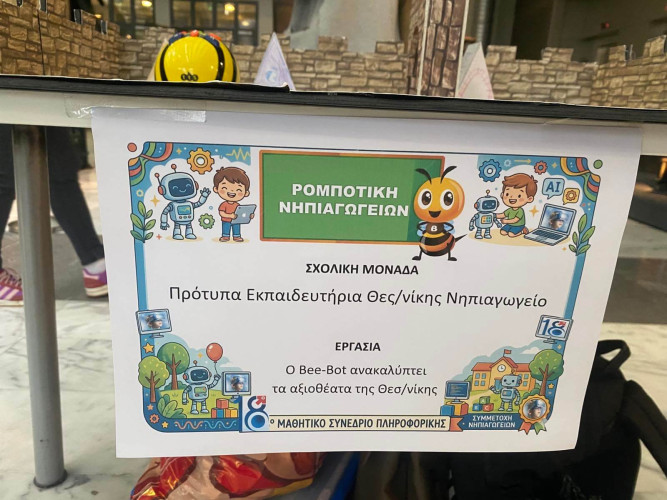 28 Απριλίου 2026Οι μαθητές μας του Νηπιαγωγείου μας συμμετείχαν στο 18ο μαθητικό συνέδριο πληροφορικής που πραγματοποιήθηκε στο ΝΟΗΣΙΣ την Τρίτη 21 Απριλίου. Τα παιδιά παρουσίασαν το εντυπωσιακό έργο τους "Ο Beebot ανακαλύπτει τα αξιοθέατα της Θεσσαλονίκης", τ΄οποίο δημιούργησαν κατά τη διάρκεια της σχολικής χρονιάς στο μάθημα της πληροφορικής. Συντροφιά με το μικρό «μελισσάκι» Βeebot έλυσαν γρίφους και το προγραμμάτισαν δίνοντας του τις κατάλληλες εντολές, με σκοπό να πλοηγηθεί σωστά στην πόλη μας και να ανακαλύψει τα αξιοθαύμαστα μνημεία της.