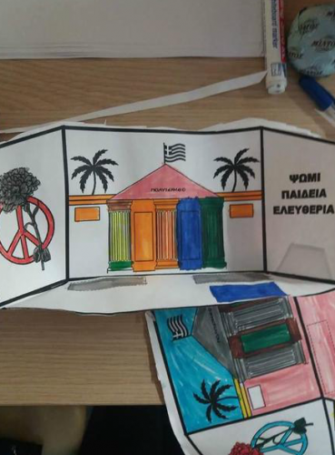 ...για τη γιορτή της εξέγερσης,για τη γιορτή της δημοκρατίας τα νηπιάκια μας ζωγράφισαν "δυο καρδιές κι έναν ήλιο στη μέση" και με πηλό ζωντάνεψαν τα γεγονότα του Νοέμβρη του 1973, ενώ οι μαθητές της Γ΄ τάξης, αφού μίλησαν, συζήτησαν και παρακολούθησαν τη γιορτή για την επέτειο του Πολυτεχνείου έφτιαξαν το δικό τους ομοίωμα της πόρτας της σχολής που έχει μείνει σύμβολο στο πέρασμα των χρόνων.