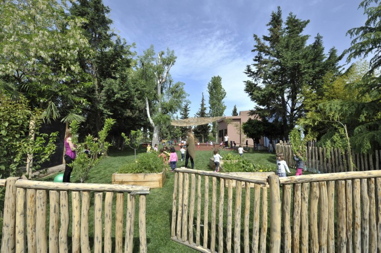 Επιπλέον, τα παιδιά απολαμβάνουν την υπέροχη καταπράσινη αυλή μας, τον αυλόγυρο του Σχολείου μας, με τη φύση σε όλο της το μεγαλείο. Παρατηρούν με ενθουσιασμό τον κύκλο της ζωής των λουλουδιών και μαθαίνουν τα ονόματα διάφορων φρούτων και λαχανικών στον μαγευτικό λαχανόκηπο που τα ίδια δημιουργούν. Καθημερινά ανακαλύπτουν μικρά πλασματάκια του ζωικού βασιλείου, "μαγειρεύουν" στην εξωτερική κουζίνα μας, τραγουδούν, απασχολούνται με παιχνίδια δεξιοτήτων και ψυχαγωγούνται στο σύνθετο της παιδικής χαράς.