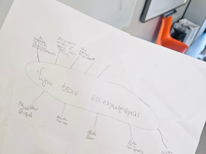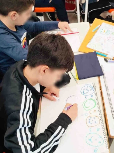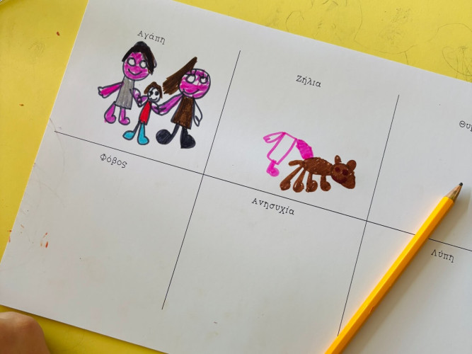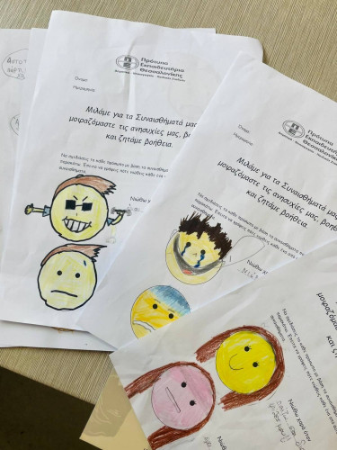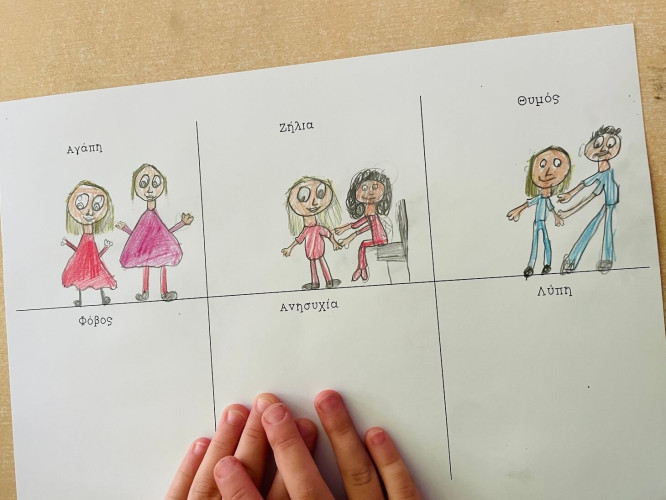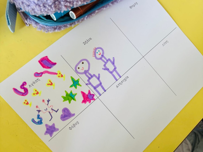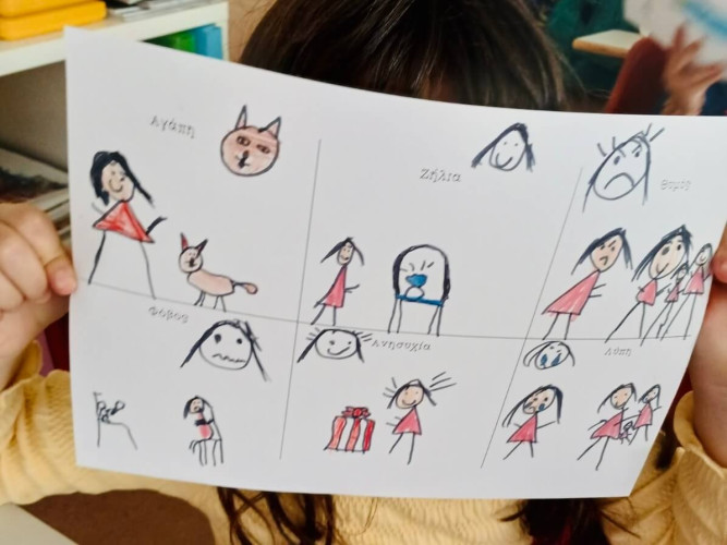 Οι μαθητές μας της Δ΄τάξης μοιράστηκαν τις ανησυχίες τους, μίλησαν για τα συναισθήματά τους και έπειτα έδωσαν σε αυτά μορφή. Σχεδίασαν και ζωγράφισαν μικρά προσωπάκια με βάση κύρια συναισθήματα που μπορεί να νιώσουμε καθημερινά. Στη συνέχεια σε κάθε συναίσθημα συμπλήρωσαν τη δική τους προσωπική στιγμή δείχνοντας πώς νιώθουν κάθε φορά που συμβαίνει αυτό.