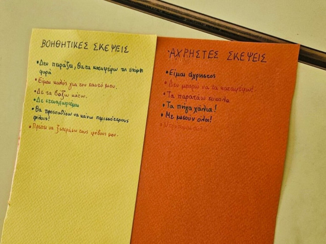 Οι μαθητές μας της Ε΄τάξης χωρίστηκαν σε τέσσερις ομάδες και η κάθε ομάδα ζωγράφισε τις σκέψεις που κάνει ένας άνθρωπος αναλόγα με τα συναισθήματα που αισθάνεται. Η 1η ομάδα ζωγράφισε «τα συναισθήματα του θυμού και της οργής» και επεξεργάστηκε τι νιώθουν, τι κάνουν και τι θα μπορούσαν να κάνουν οι άνθρωποι όταν θυμώνουν... Η 2η ομάδα έγραψε κάποιες «άσχημες σκέψεις» που έρχονται στο μυαλό μας μερικές στιγμές τις οποίες στη συνέχεια αντικατέστησε με ευχάριστους λογισμούς. Η 3η ομάδα σχεδίασε κύκλους και οι μαθητές έγραψαν τι νιώθουν όταν αισθάνονται αδύναμοι και η 4η ομάδα σχεδίασε χαρούμενες φατσούλες εκφράζοντας την αισιοδοξία. Τα παιδιά μας ακόμη επικεντρώθηκαν στον έλεγχο του θυμού και στην ενίσχυση της θετικής σκέψης εστιάζοντας στην αισιοδοξία και στον αυτοέλεγχο. Μέσα από τις δημιουργίες τους εκφράστηκαν ελεύθερα και απέδωσαν με το δικό τους μοναδικό τρόπο τα συναισθήματα και τις σκέψεις τους.