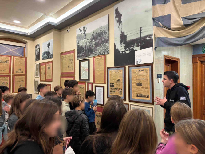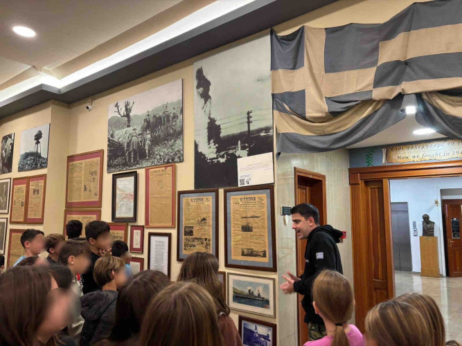 30 Οκτωβρίου 2025Οι μαθητές μας της Στ΄τάξης επισκέφτηκαν το Πολεμικό Μουσείο Θεσσαλονίκης και συμμετείχαν στο βιωματικό εκπαιδευτικό πρόγραμμα με τίτλο «Μαθαίνοντας για την ειρήνη, τα ανθρώπινα δικαιώματα και την κοινωνική αλλαγή». Το «ταξίδι» στον χρόνο ξεκίνησε και τα παιδιά περιηγήθηκαν στις αίθουσες, είδαν μοναδικά εκθέματα και ανακάλυψαν πτυχές της νεότερης ελληνικής ιστορίας μέσα από αυθεντικά τεκμήρια και αφηγήσεις. Οι μαθητές εξέφρασαν τις σκέψεις τους για τις αξίες της συνεργασίας, της ειρήνης και του σεβασμού στον άνθρωπο και αντιλήφθηκαν πως η γνώση της ιστορίας μάς βοηθάει να οικοδομήσουμε ένα καλύτερο και πιο ειρηνικό μέλλον. Η δράση πραγματοποιήθηκε στο πλαίσιο του μαθήματος της Ιστορίας και των Εργαστηρίων Δεξιοτήτων, στον θεματικό άξονα για τα ανθρώπινα δικαιώματα με στόχο την καλλιέργεια της ενσυναίσθησης, της υπευθυνότητας και της δημοκρατικής συνείδησης.