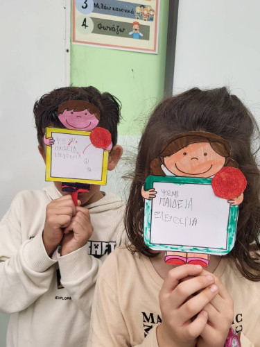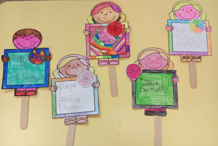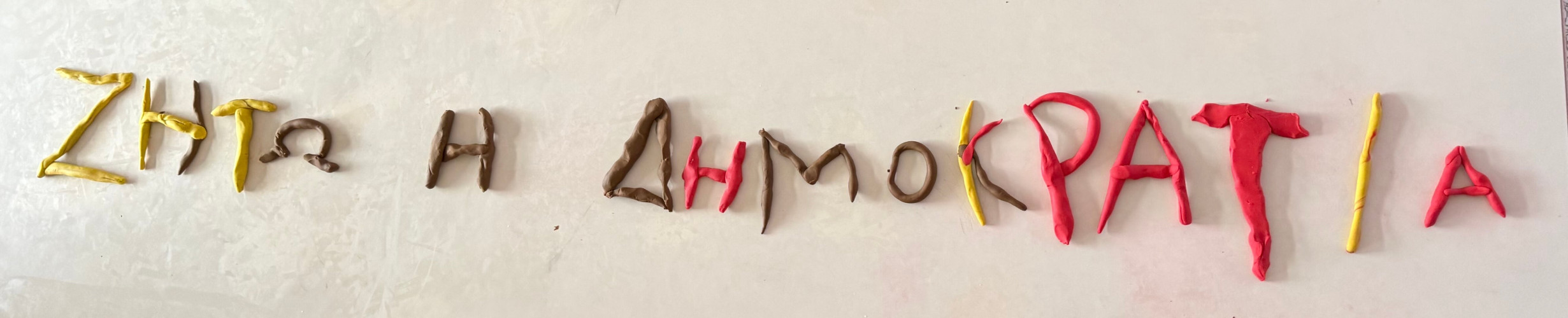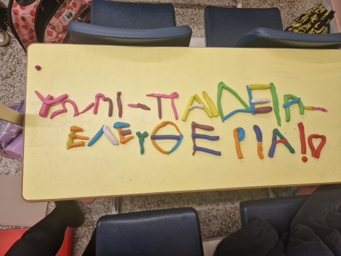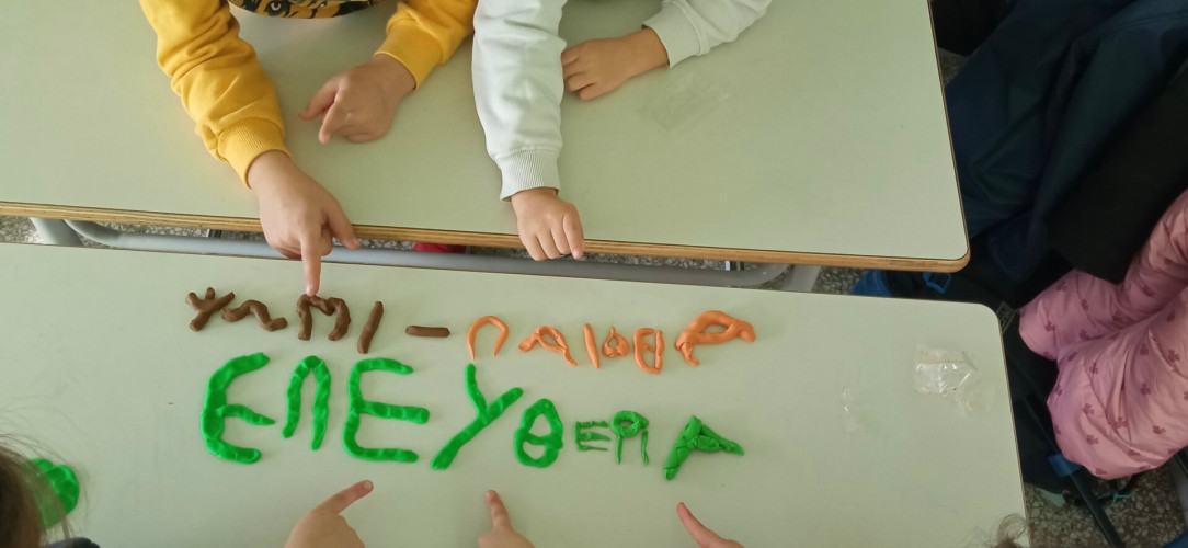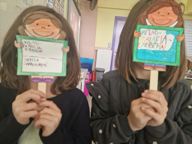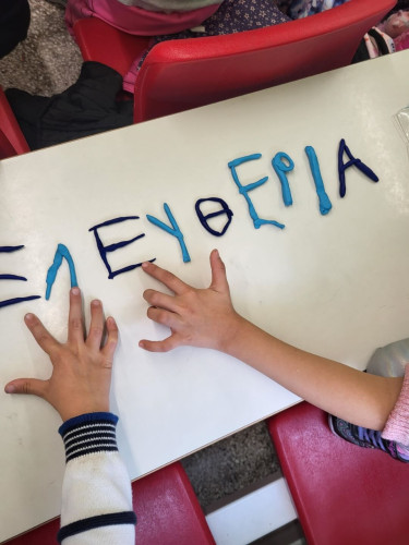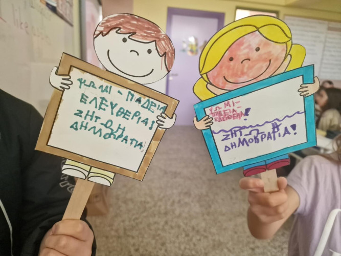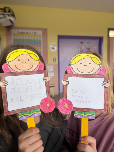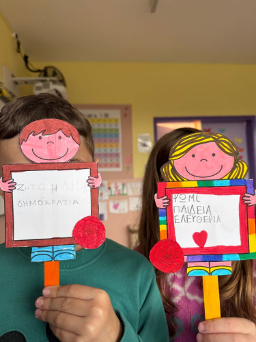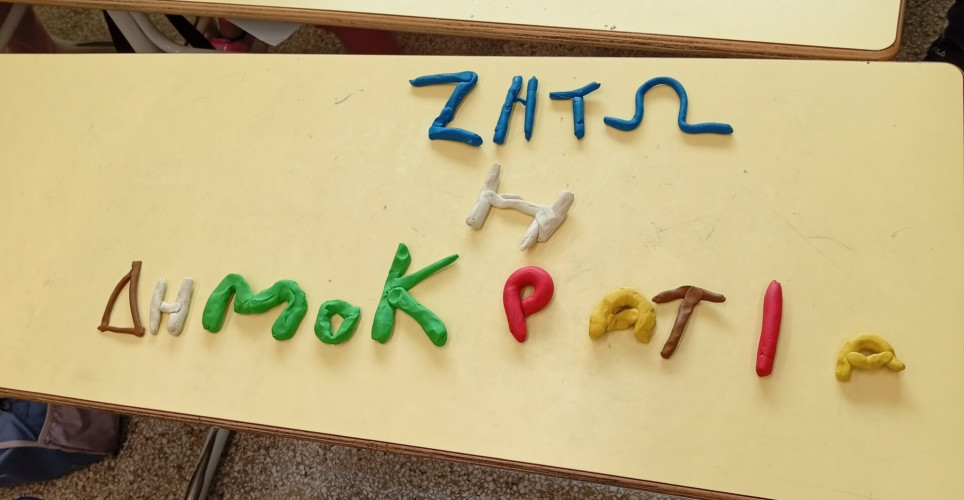 17 Νοεμβρίου 2025Τα πρωτάκια μας αφού παρακολούθησαν τη γιορτή που ετοίμασαν οι μαθητές της Δ΄τάξης έφτιαξαν μια χάρτινη κατασκευή και «έγραψαν», ομαδικά, τα συνθήματα «Ψωμί, Παιδεία, Ελευθερία» και «Ζήτω η Δημοκρατία» με πλαστελίνη.