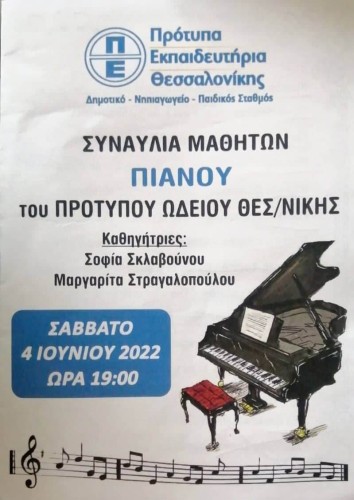 08 Ιουνίου 2022Τα παιδιά μας απ’ όλα τα τμήματα πιάνου του Πρότυπου Ωδείου Θεσσαλονίκης πραγματοποίησαν συναυλία με κομμάτια που έμαθαν κατά τη διάρκεια της χρονιάς. Η καταπράσινη αυλή μας γέμισε από το κοινό των μικρών μας πιανιστών, αλλά και από τις μελωδίες και την ενέργεια που μας χάρισαν. Στο τέλος της εκδήλωσης ο διευθυντής του Πρότυπου Ωδείου μοίρασε έπαινο σε κάθε μαθητή και τον συνεχάρη για την προσπάθεια, την επίδοση και τη μουσική παιδεία που αποκόμισε.