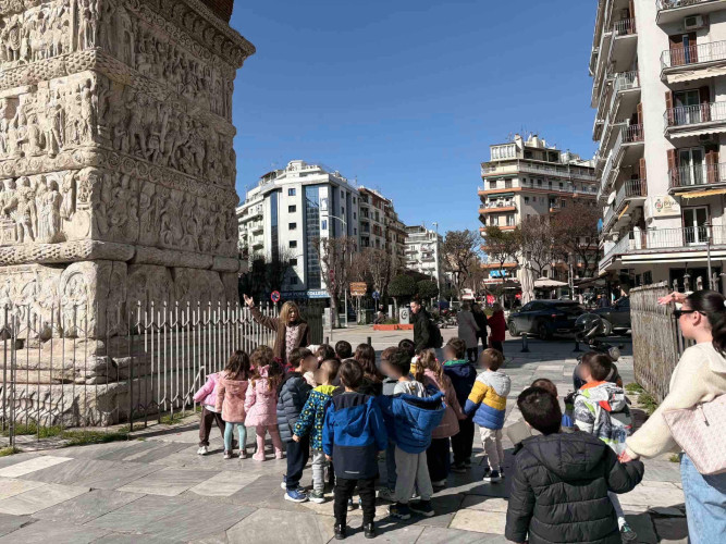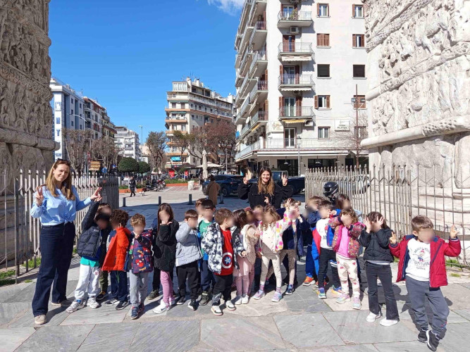 05 Μαρτίου 2026Θεσσαλονίκη, μια πόλη πολιτισμική με πολλά χρώματα και αρώματα που η ιστορία της εξελίσσεται σε κάθε στενό της. Τα νηπιάκια μαςμε στόχο να ανακαλύψουν κάθε γωνιά της πόλης μας περιηγήθηκαν με τα σχολικά μας λεωφορεία στα σημαντικότερα αξιοθέατα της Θεσσαλονίκης. Η ξενάγηση ξεκίνησε από τα κάστρα με θέα ολόκληρο τον Θερμαϊκό κόλπο, συνεχίστηκε στη Ροτόντα και έπειτα τα παιδιά κατευθύνθηκαν στην Καμάρα. Η τελευταία στάση της διαδρομής ήταν στο άγαλμα του Μ. Αλεξάνδρου, όπου εκεί ενημερώθηκαν για τη ζωή και το έργο του σπουδαίου στρατηλάτη. Απολαμβάνοντας την όμορφη ημέρα περπάτησαν και βρέθηκαν στο εμβληματικό εικαστικό έργο του Γιώργου Ζογγολόπουλου, «Ομπρέλες» στη νέα παραλία. Οι μαθητές θαύμασαν τα μνημεία και έμαθαν βιωματικά για το παρελθόν που διαδραματίστηκε στην πόλη μας.