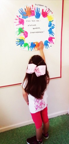 17 Σεπτεμβρίου 2021Είναι η φράση με την οποία συνήθως ξεκινάει μια γνωριμία. Μερικές απ΄ αυτές καταλήγουν σε φιλία: έννοια ουσιαστική και πολύτιμη για όλους μας. Τα προνηπιάκια μας κάνουν τα πρώτα τους βήματα προς την κοινωνικοποίηση, αλλά και τη θεμελίωση σχέσεων που μπορεί να διαρκέσουν μια ζωή. Το «Στεφάνι της φιλίας» δημιουργήθηκε σε κάθε τάξη απ΄ όλα μας τα παιδιά με το αποτύπωμα, την αγάπη, το χαμόγελο και την καλή τους διάθεση! Στο σχολείο μας καλλιεργούμε τις αξίες της εμπιστοσύνης και της συνέπειας που απαιτεί η ανθρώπινη έκφραση.