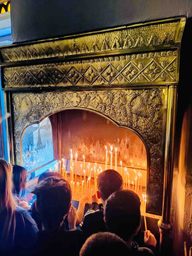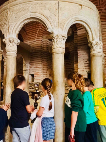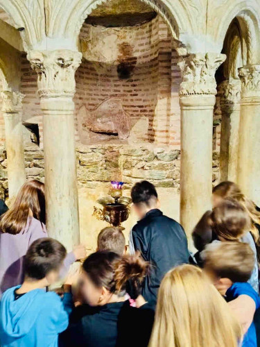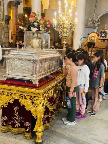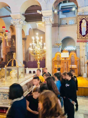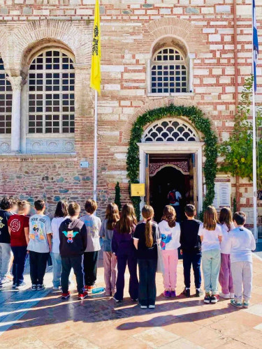 29 Οκτωβρίου 2025Ενόψει του εορτασμού του Πολιούχου της Θεσσαλονίκης, οι μαθητές μας της Ε΄ τάξης επισκέφτηκαν τον Ιερό Ναό του Αγίου Δημητρίου του Μυροβλήτου. Συνοδευόμενοι από τους δασκάλους τους, ξεναγήθηκαν στον ναό, παρατήρησαν τα ψηφιδωτά και τις αγιογραφίες, προσευχήθηκαν και προσκύνησαν τα ιερά λείψανα του Αγίου. Η περιήγησή τους συνεχίστηκε στις κατακόμβες, στον τόπο του μαρτυρίου του, όπου έδωσε τη ζωή του υπερασπιζόμενος τη χριστιανική πίστη. Τα παιδιά μας έμαθαν με βιωματικό τρόπο την προσφορά του Μεγαλομάρτυρα Δημητρίου στην πόλη ως φύλακας και προστάτης της.