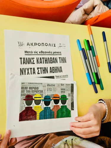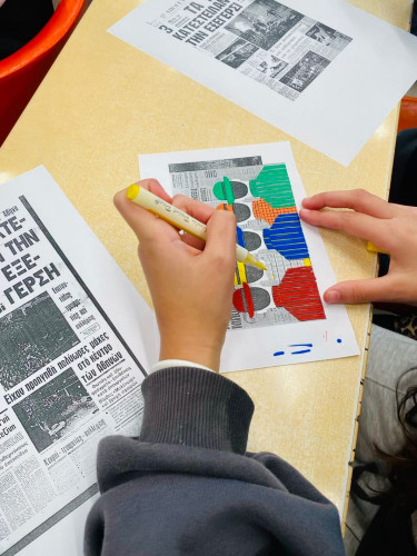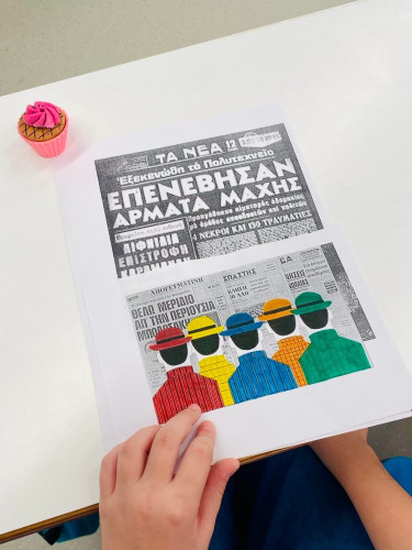 17 Νοεμβρίου 2025Οι μαθητές μας της Ε΄τάξης άρχισαν να ξεφυλλίζουν τα πρωτοσέλιδα των εφημερίδων που αποτυπώνουν ακόμα τα γεγονότα που σημειώθηκαν τις πρώτες πρωινές ώρες, της 17 Νοεμβρίου 1973. «Τα τανκς κατέστειλαν την εξέγερση», «Τανκς κατήλθαν τη νύχτα στην Αθήνα», «Εξάωρη μάχη στην Αθήνα» είναι κάποιοι από τους τίτλους που παρουσιάζουν τι συνέβη πραγματικά εκείνες τις ημέρες στην Αθήνα και όχι μόνο. Στη συνέχεια, συνδυάζοντας τις πληροφορίες που έμαθαν με τον πίνακα του Γιάννη Γαϊτη «Λαθραναγνώστες» τα παιδιά πέρασαν το δικό τους μήνυμα της ανάγκης για φωνή και ελευθερία εκείνη την εποχή. Μέσα από δραστηριότητες αντιλήφθηκαν καλύτερα τη σημασία λέξεων σχετικών με την ημέρα του Πολυτεχνείου, ενώ άκουσαν και τραγούδια γραμμένα στη μνήμη όσων έδωσαν τη ζωή τους για την πτώση της δικτατορίας.